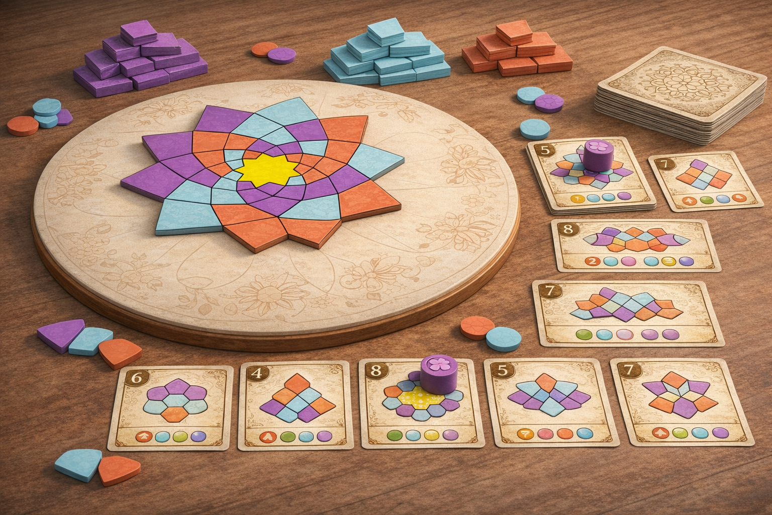 Au fil de la partie, la fleur grandit du centre vers l’extérieur. Les motifs se répètent, se chevauchent et apparaissent à plusieurs échelles, ce qui permet parfois de valider plusieurs cartes en un seul tour. Les règles sont simples, mais la maîtrise du plateau demande de l’attention, de la planification et un bon sens des opportunités.